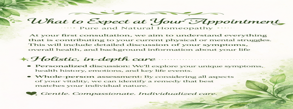 Maybe you're dealing with a chronic condition, facing an acute illness, or simply struggling to feel like yourself. You don’t have to navigate this alone. Homeopathy offers a gentle, natural approach to restoring balance and supporting your overall well-being.